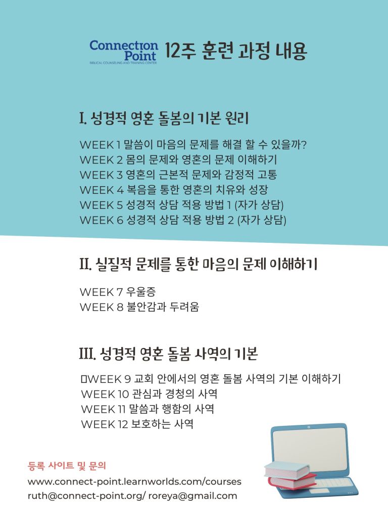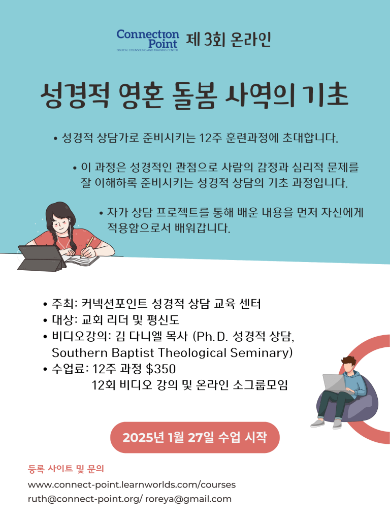 Connection Point Biblical Counseling & Training Center에서는 목회자, 사모, 리더, 평신도를 위한 성경적상담 훈련 과정을 제공합니다. 이번 과정은 ‘성경적 영혼 돌봄 사역의 기초’를 주제로 12주간 진행됩니다.